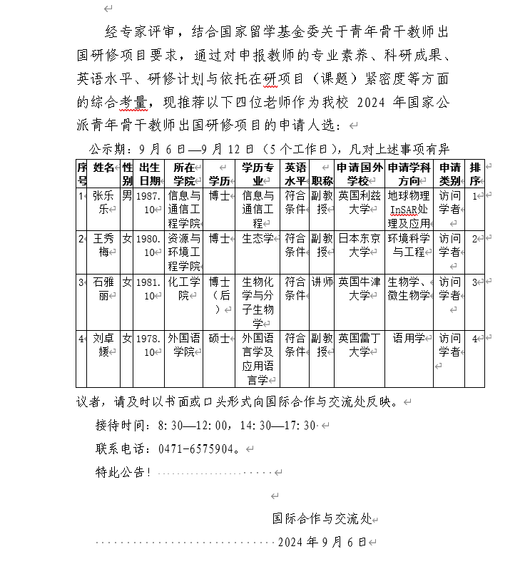 关于beat365正版2024年国家公派青年骨干教师出国研修项目评审结果的公示