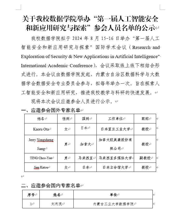 关于公司数据学院举办“第一届人工智能安全和新应用研究与探索”参会人员名单的公示