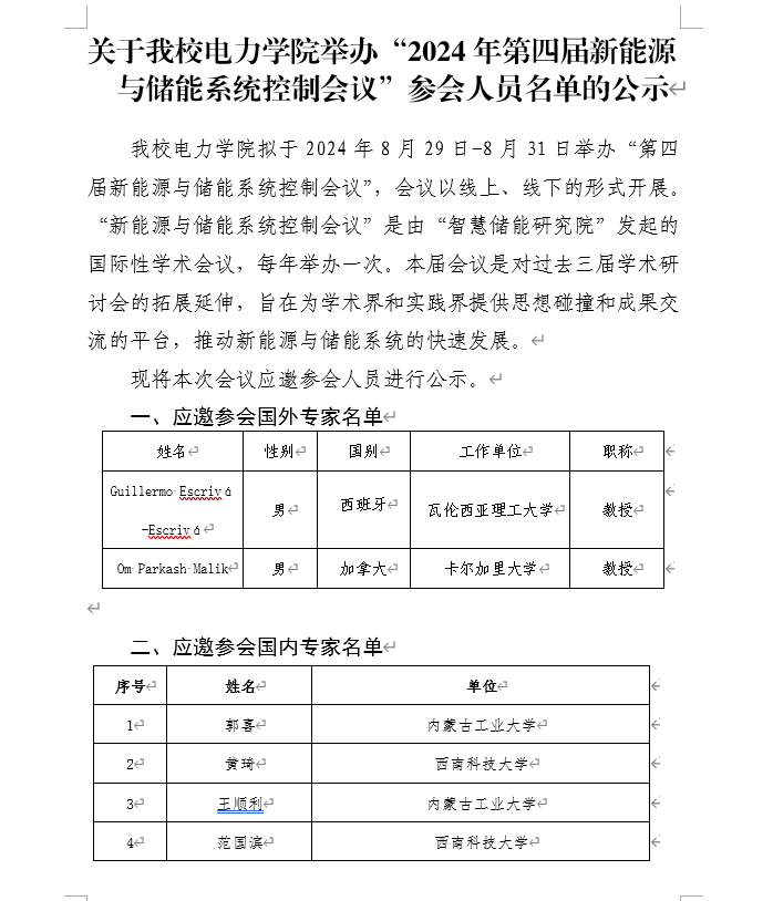 关于公司电力学院举办“2024年第四届新能源与储能系统控制会议”参会人员名单的公示