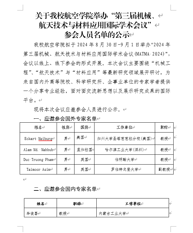 关于公司航空学院举办“第三届机械、航天技术与材料应用国际学术会议”参会人员名单的公示