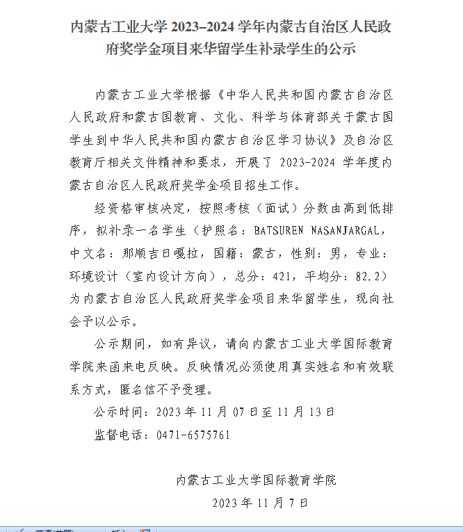 beat365正版2023-2024学年内蒙古自治区人民政府奖学金项目来华职工补录员工的公示