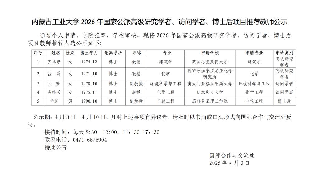 beat365正版2026年国家公派高级研究学者、访问学者、博士后项目推荐教师公示